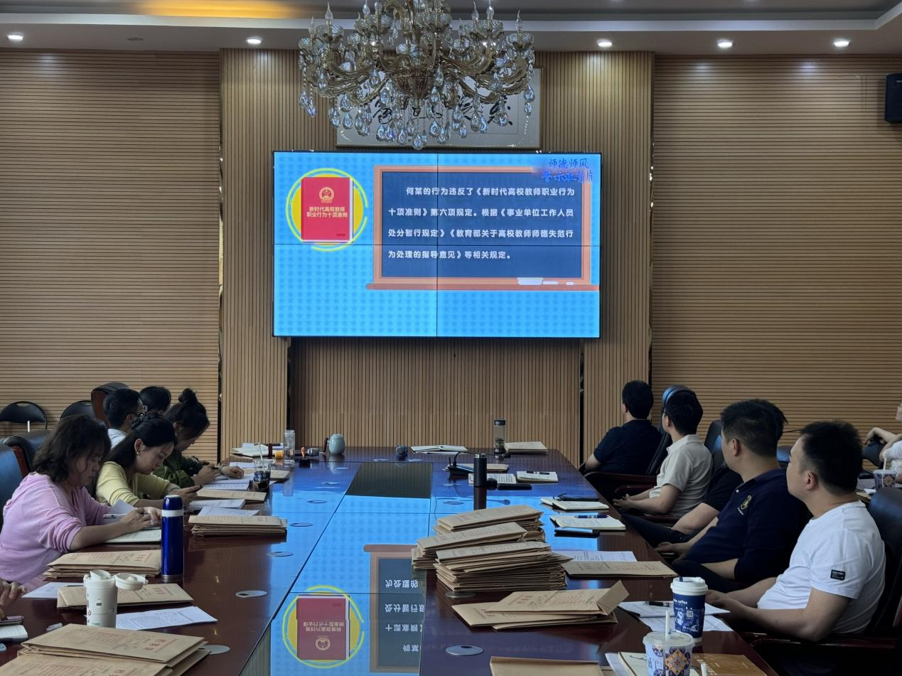 会上,全体教师集中观看了违反《新时代高校教师职业行为十项准则》的警示教育视频。视频中选取了多个典型案例,通过真实的事件和深刻的剖析,生动呈现了师德失范行为的严重后果,为在场的每一位教师敲响了警钟。这些案例涵盖了学术不端、师生关系不当、教学敷衍等多个方面,让教师们深刻认识到坚守师德底线的重要性和紧迫性。