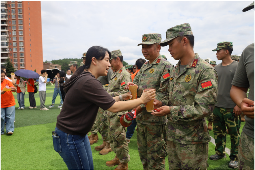 党委书记李佩强调:军训不仅是国防教育的“必修课”,更是塑造责任担当、凝聚集体荣誉感的“成长课”。她鼓励新生在汗水中收获蜕变,为未来的老员工活打下坚实基础。随后,一行领导与老师为新生发放慰问物资。