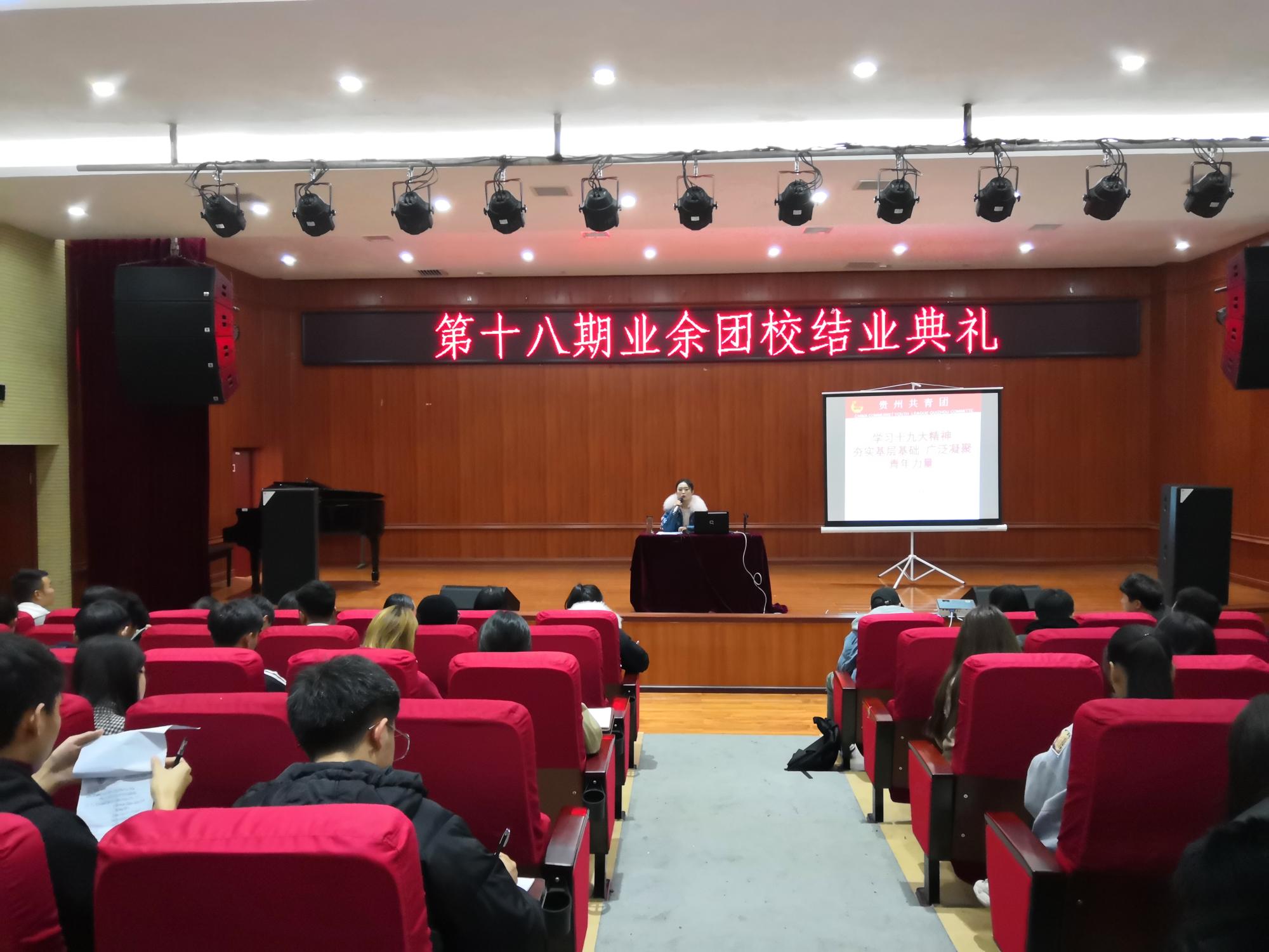 11月26日,2026年世界杯官网团委在六楼表演厅举行了第十八期业余团校培训结业典礼暨专题讲座,团委书记舒然担任主讲人,开展了主题为:“学习十九大精神,夯实基层基础,广泛凝聚青年力量”的专题讲座。
