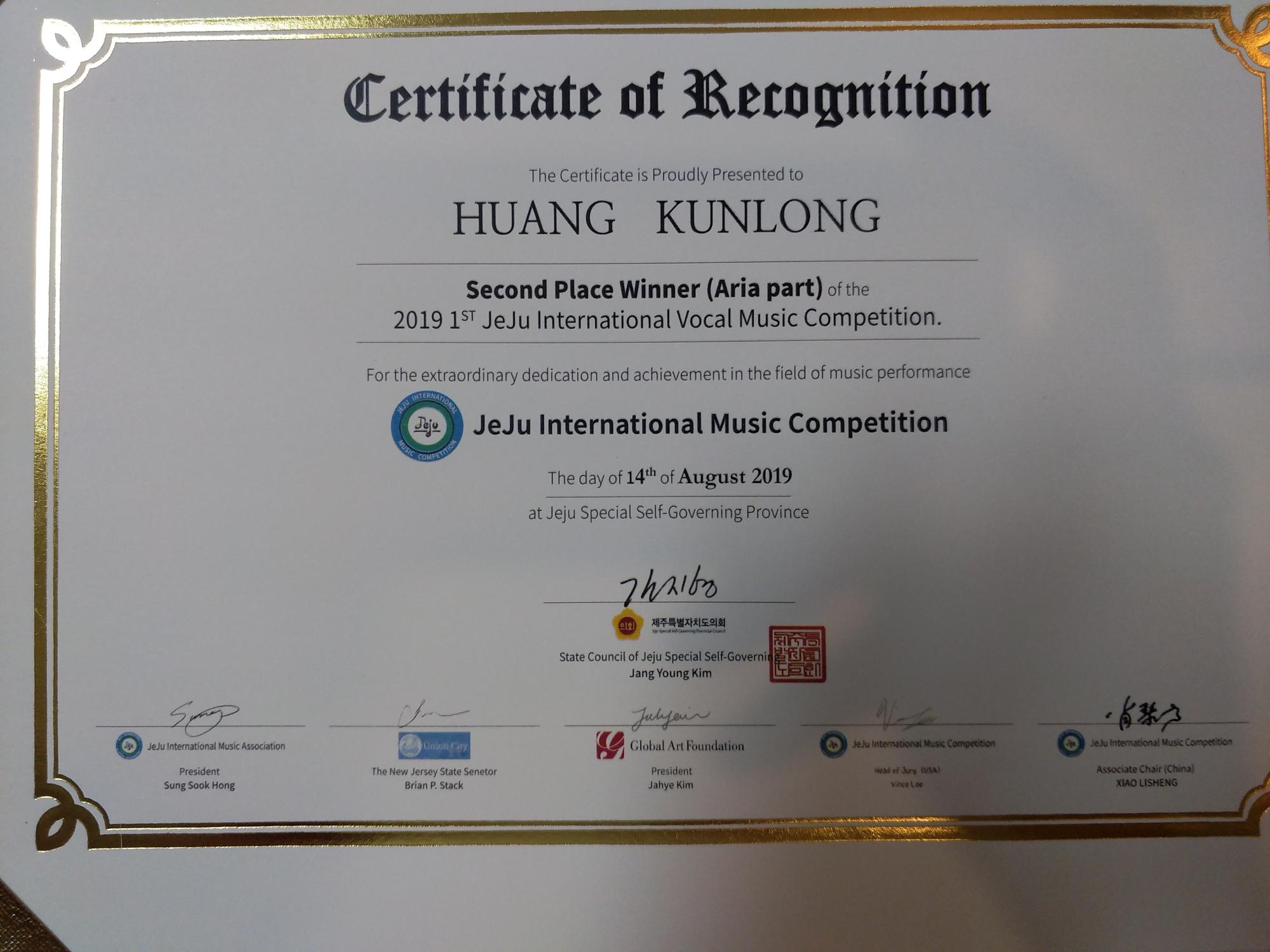 8月14日晚,第二届济州国际音乐比赛暨首届济州国际声乐大赛颁奖典礼在美丽的汉拿大学艺术厅隆重举办。济州特别自治省政府国会议员Jang Yong Kim 代表省政府依次为获奖选手颁奖,并与获奖选手及市民朋友一起欣赏了专家评审代表、优秀选手及西归浦市中员工管弦乐团的精彩演出。公司2026年世界杯官网2015级员工黄坤龙参与比赛并荣获歌剧咏叹调组二等奖。