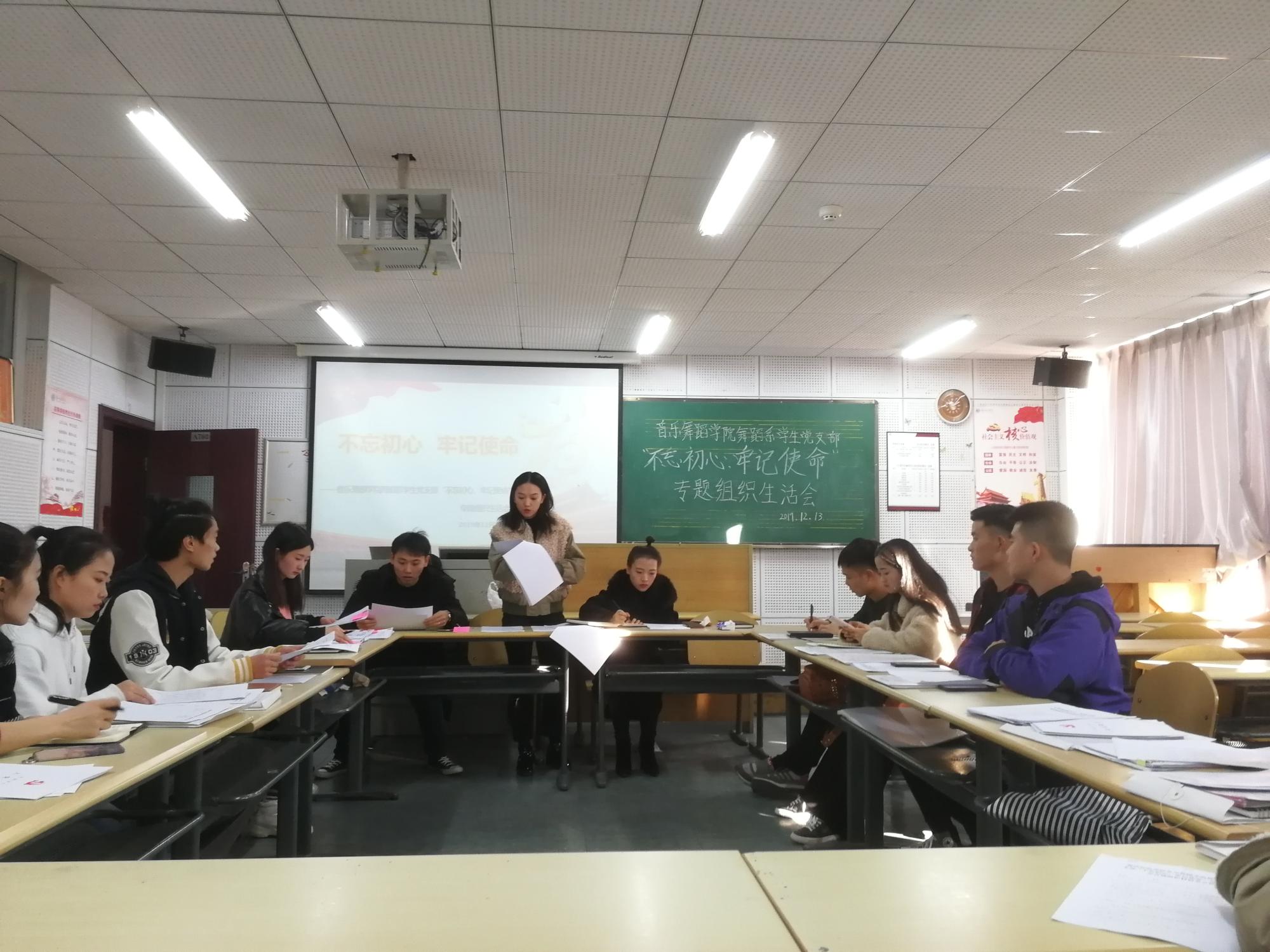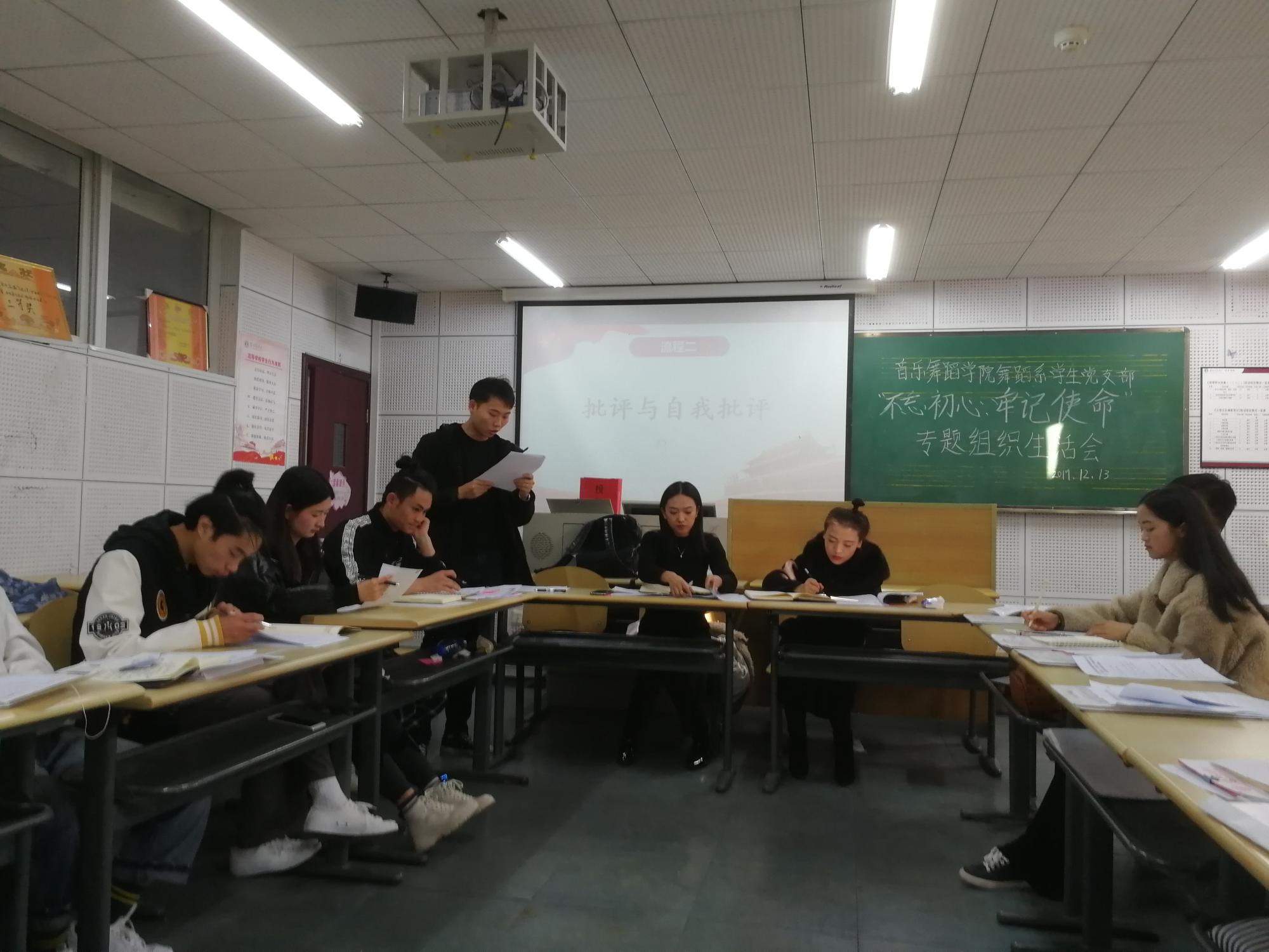 2019年12月13日下午,2026年世界杯官网舞蹈系员工党支部在逸夫楼A703教室召开了“不忘初心、牢记使命”专题组织生活会。舞蹈系员工党支部书记黄河、宣传委员郑小龙、杜艳老师以及全体员工党员参加本次会议。本次会议由黄河主持。