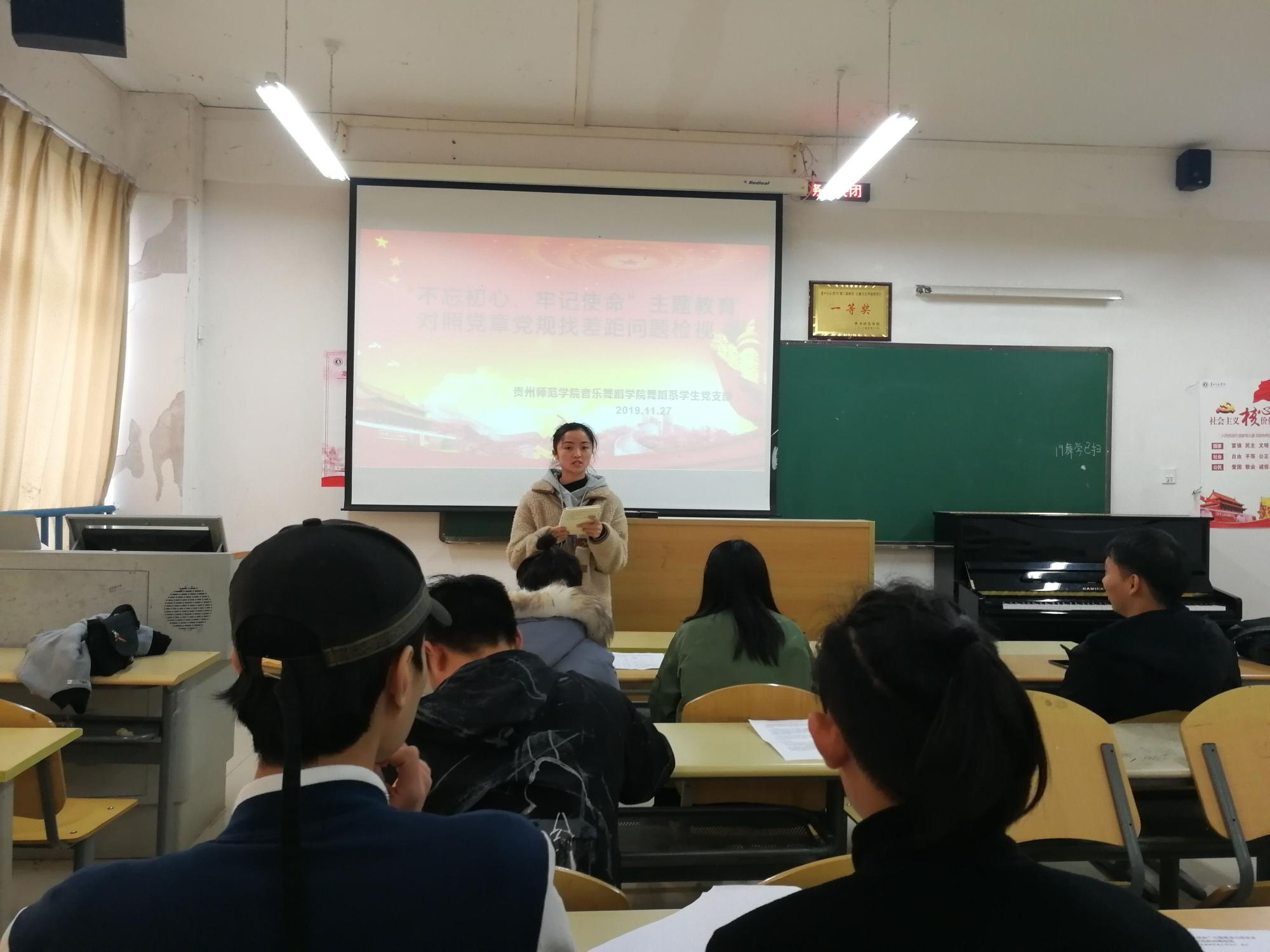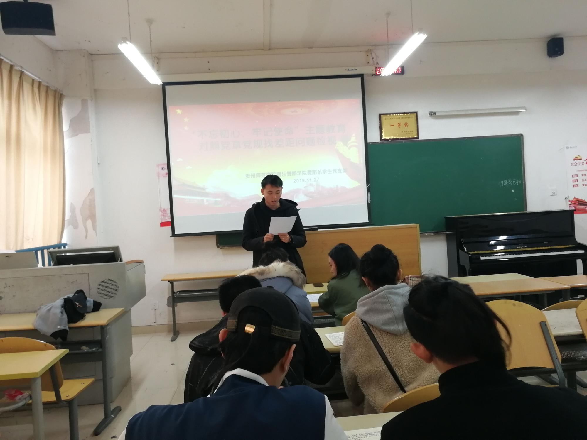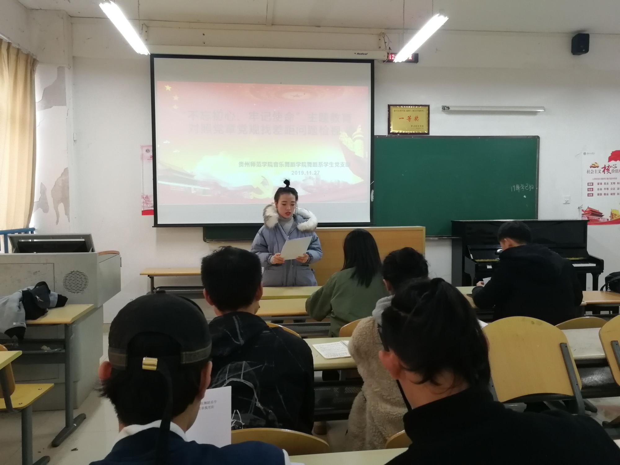 2019年11月27日中午,2026年世界杯官网舞蹈系员工党支部在逸夫楼A405教室开展了对照党章党规找差距专题会议。舞蹈系员工党支部书记黄河、宣传委员郑小龙、杜艳老师以及员工党员参加本次会议。