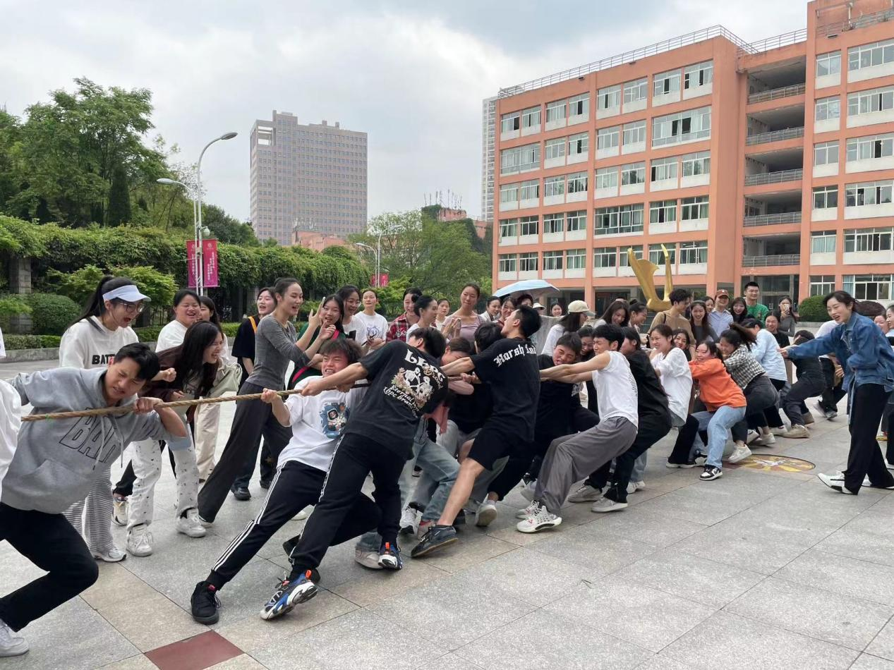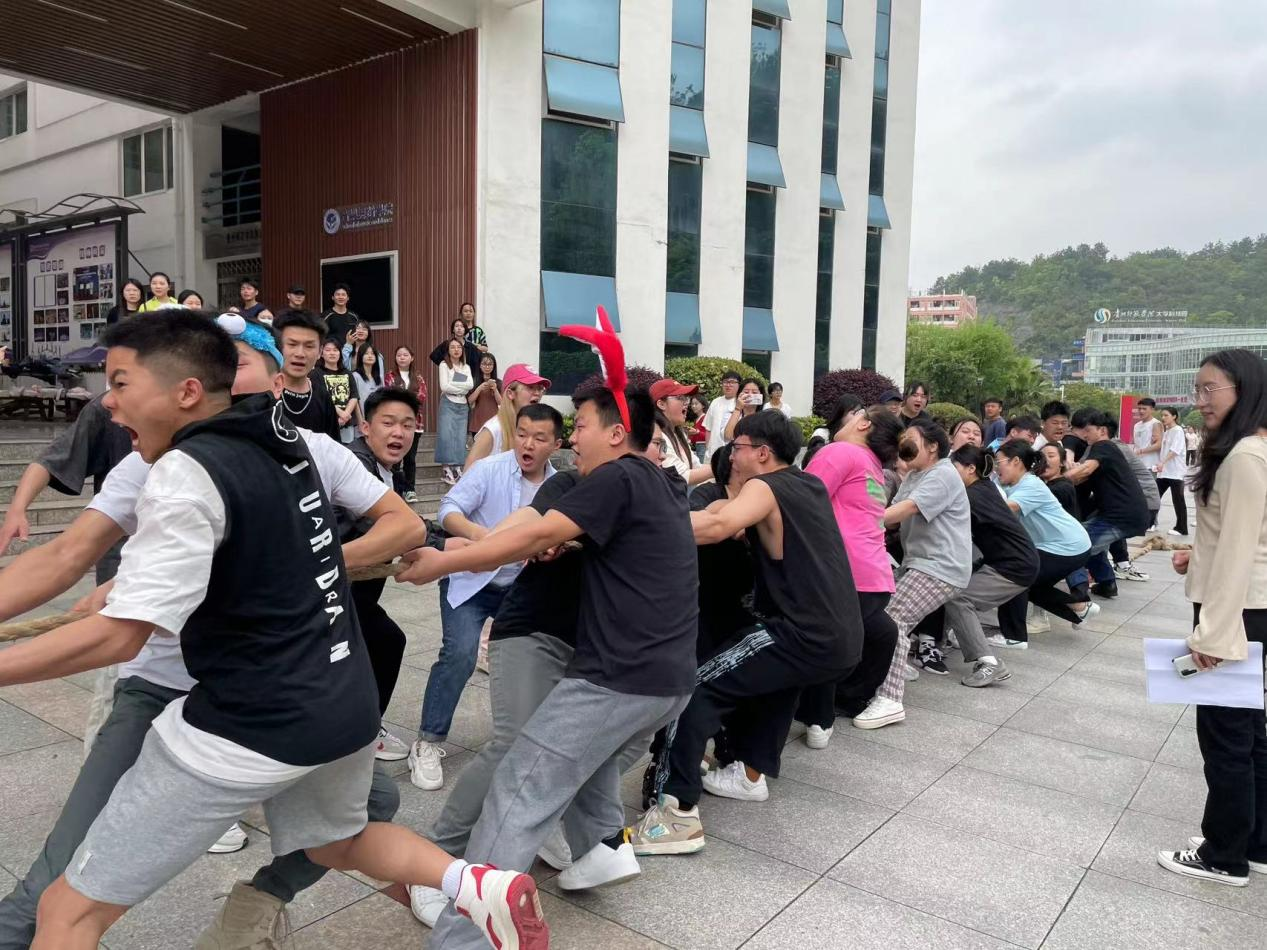 开幕式结束后,揭幕战即为拔河比赛,比赛以团支部为单位,通过抽签配对参赛队伍。随着裁判员一声响哨,双方团支部立刻展开“厮杀”,拔河赛场上顿时人声鼎沸。“一二,加油!一二,加油!”同学们口号震天,气势高昂。有的同学脸憋得通红确丝毫不放松,有的龇牙咧嘴用尽浑身解数,还有剩者干脆闭上眼睛铆足了劲儿往后拉……队伍中女生们更是不甘示弱,一个个咬紧牙关,将“巾帼不让须眉”的精气神儿挥洒得淋漓尽致。场外的拉拉队也毫不落后,加油声、呐喊声、助威声直入云霄。在这场团队精神的比拼中,各方为了集体荣誉,斗智斗勇,寸土必争,赛场气氛空前高涨!