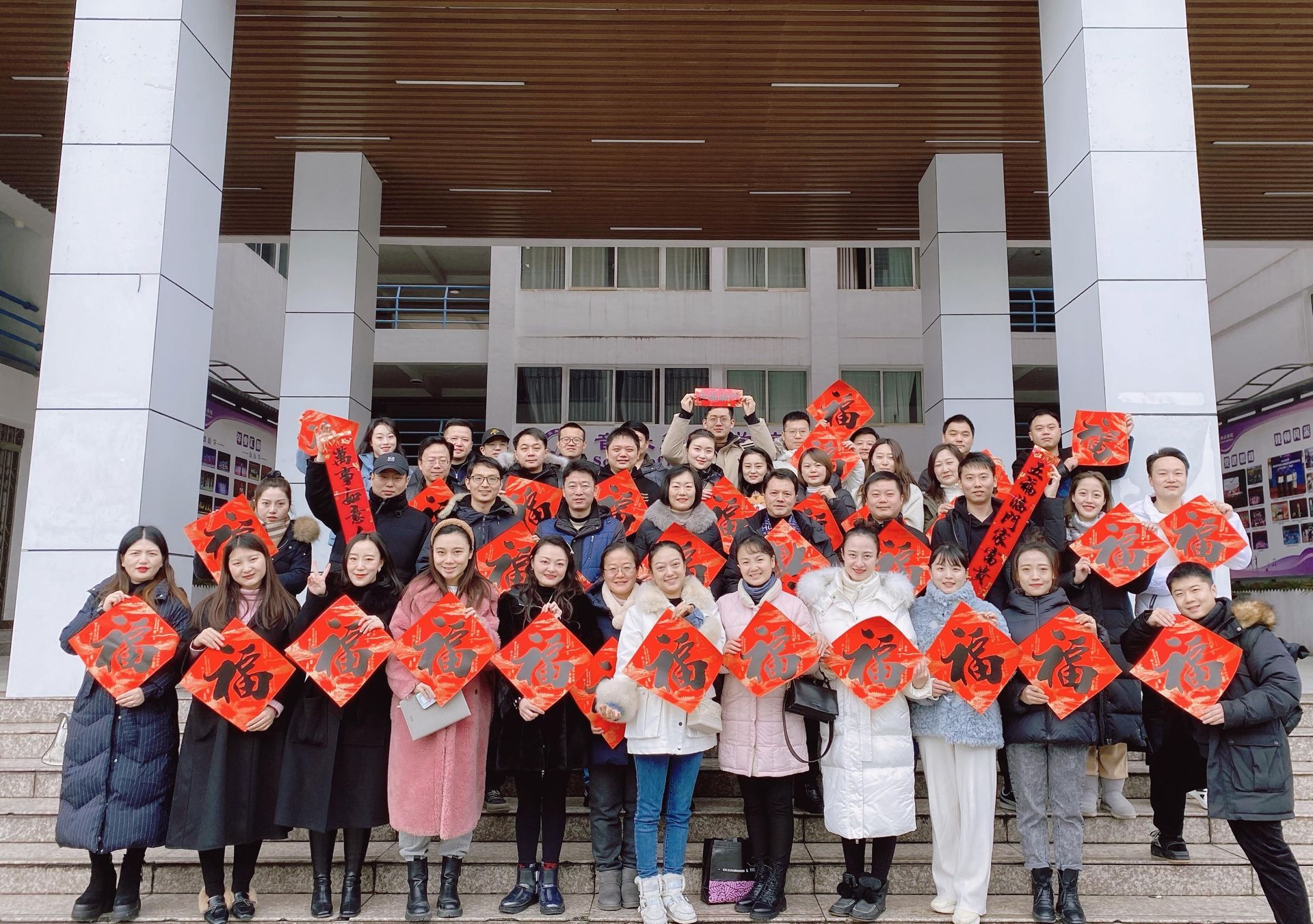 会后,全体教职工在会议室和公司门口进行春节合影留念。